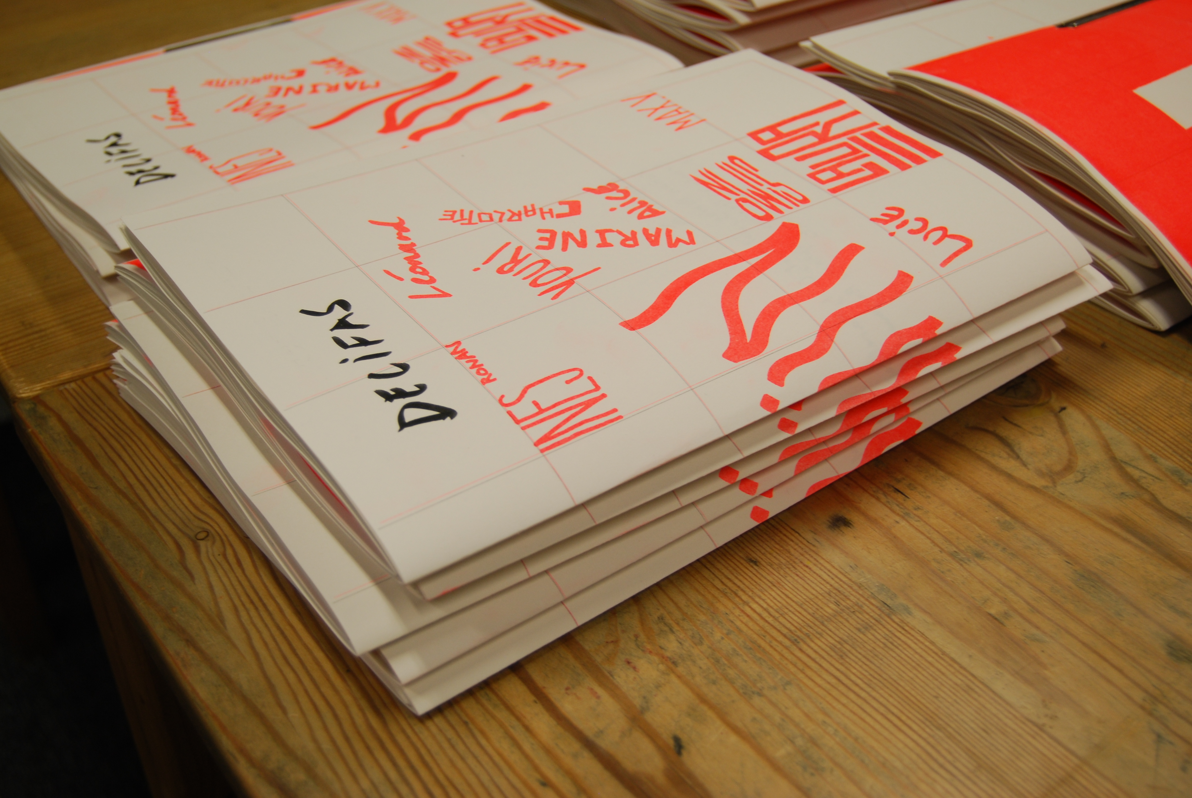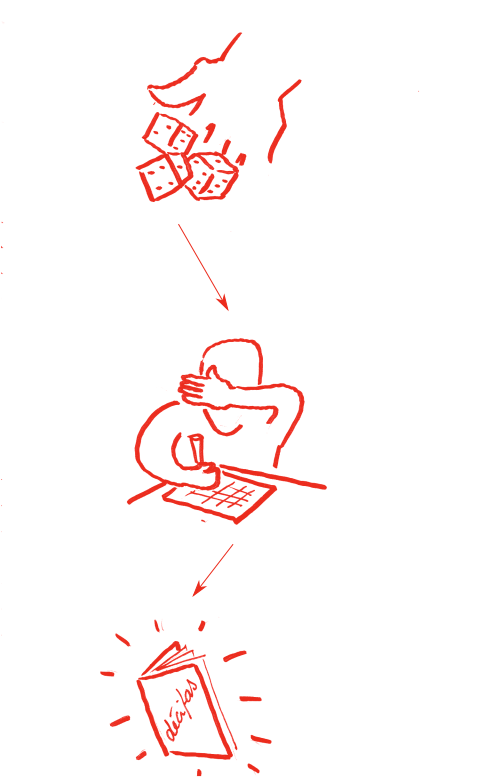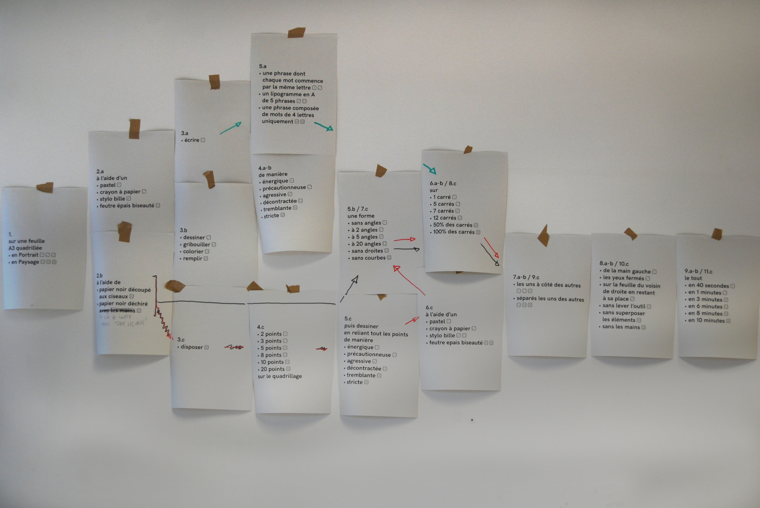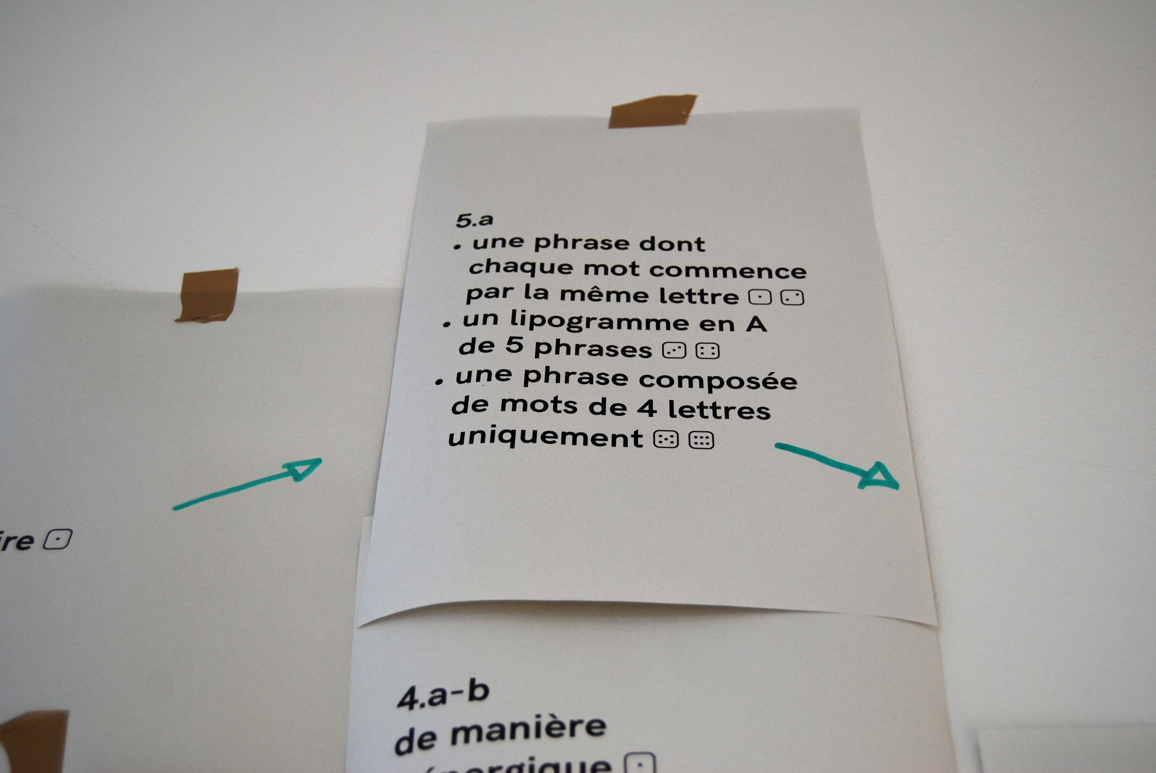 ⚀ Le but du workshop est de sensibiliser les étudiant·es à des notions que l'on retrouve dans des langages informatiques telles que les boucles et les conditions. ⚁ Le workshop se fait sans ordinateur avec un plateau de jeu sous forme de grille et une succession de règles de jeu déterminées par des lancés de dés. ⚂ À la fin de chaque "script" écrits les étudiant·es le réalisent formellement et documentent leur cheminement. ⚃ Ensuite les images sont misent en commun et les étudiant·es composent/recomposent par scans/agrandissements/négatifs et autres possibilités qu'offrent la photocopieuse laser et la Riso, un visuel en deux couleurs. ⚄ Chaque transformation est documentée sur des fiches que l'on retrouve dans la composition des visuels de l'édition. ⚅