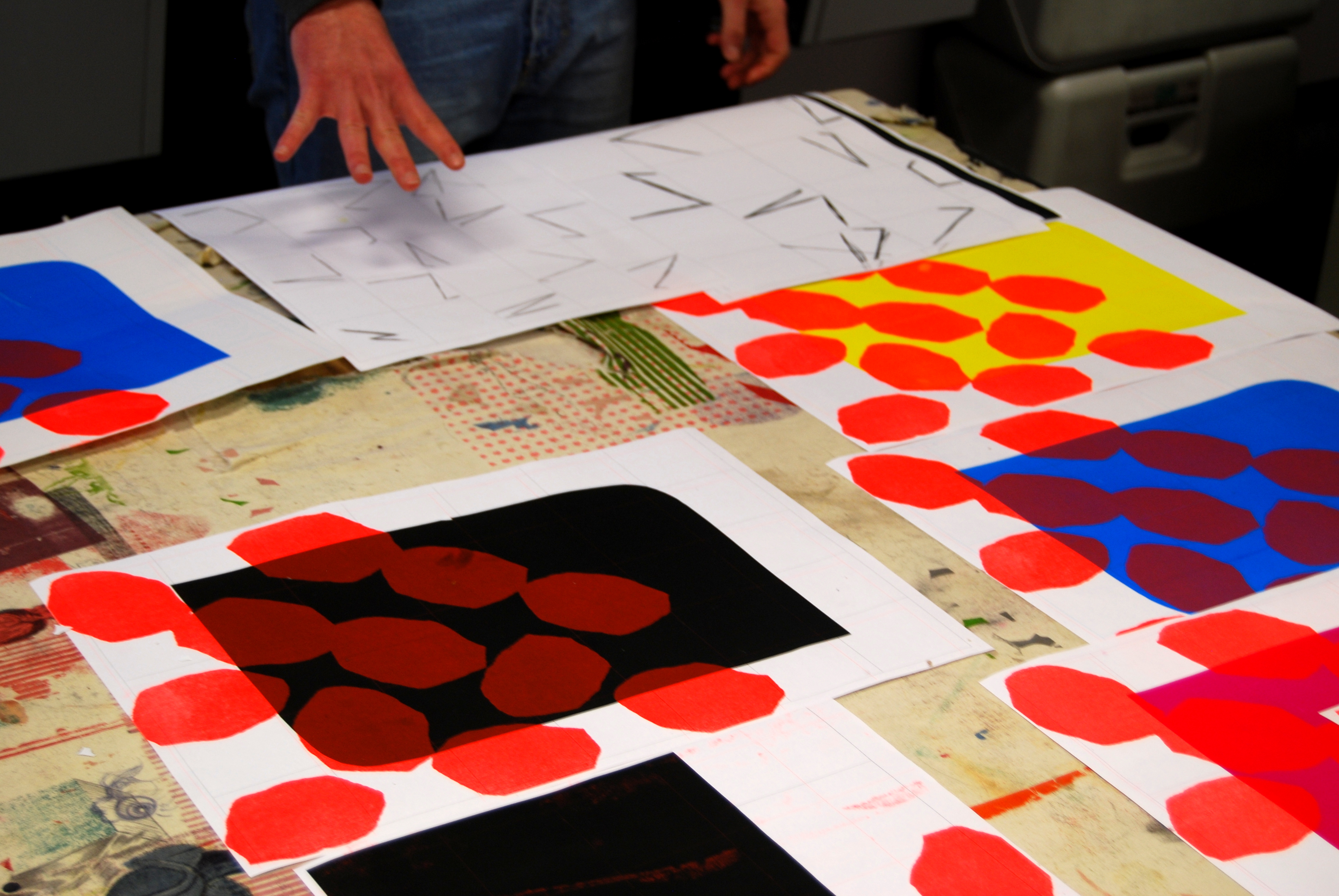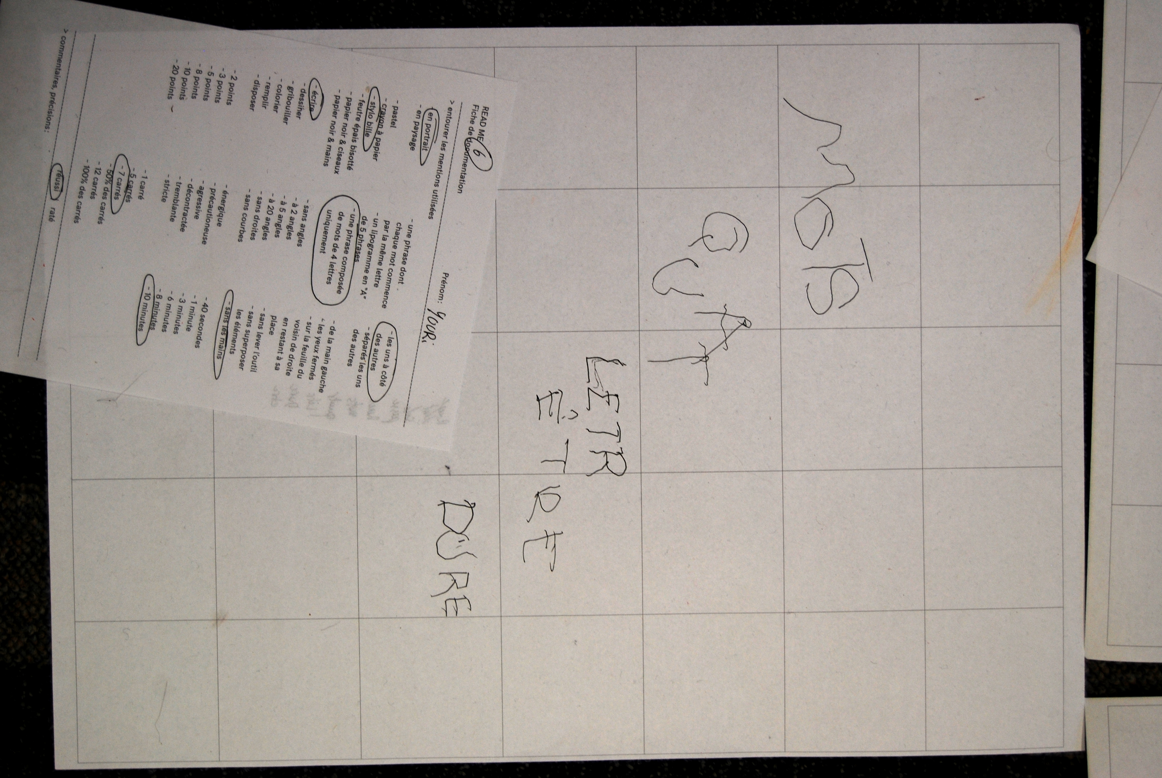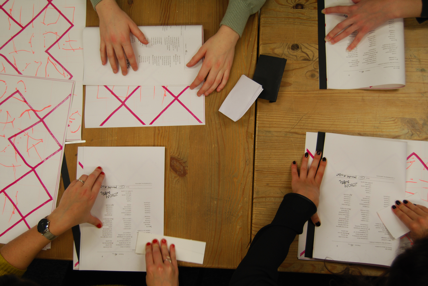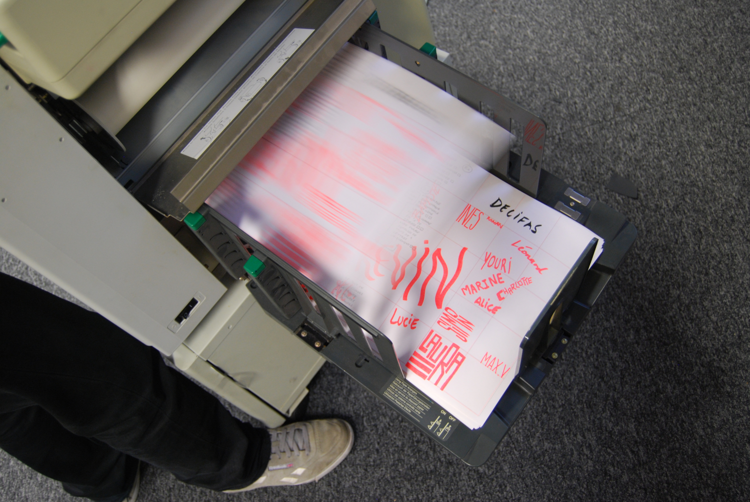 ⚀ Le but du workshop est de sensibiliser les étudiant·es à des notions que l'on retrouve dans des langages informatiques telles que les boucles et les conditions. ⚁ Le workshop se fait sans ordinateur avec un plateau de jeu sous forme de grille et une succession de règles de jeu déterminées par des lancés de dés. ⚂ À la fin de chaque "script" écrits les étudiant·es le réalisent formellement et documentent leur cheminement. ⚃ Ensuite les images sont misent en commun et les étudiant·es composent/recomposent par scans/agrandissements/négatifs et autres possibilités qu'offrent la photocopieuse laser et la Riso, un visuel en deux couleurs. ⚄ Chaque transformation est documentée sur des fiches que l'on retrouve dans la composition des visuels de l'édition. ⚅