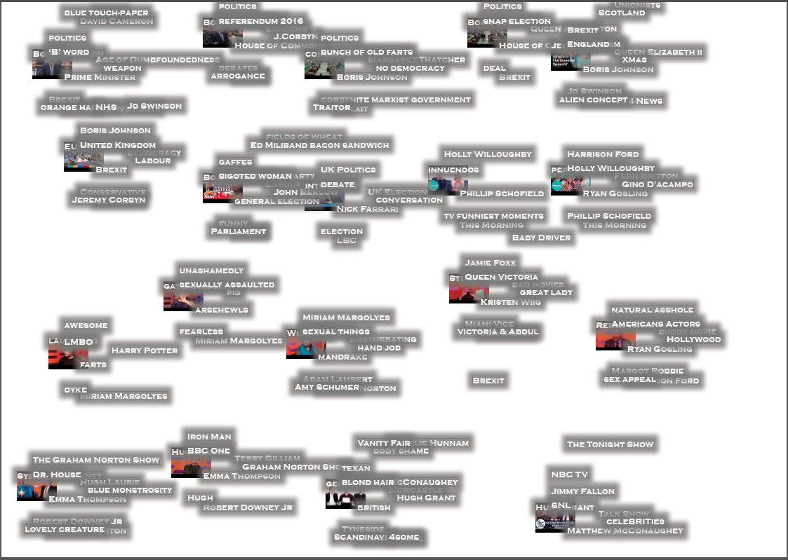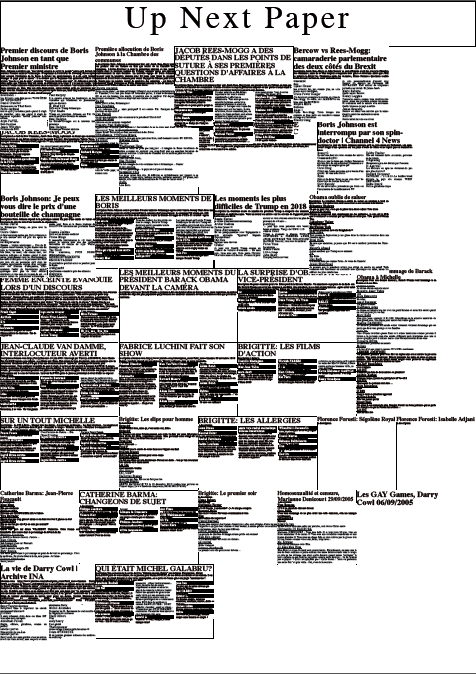 J'avais envie de travailler sur le côté «relations publiques» de la politique, sur les politiques comme personnages publics, qui essaient d'être aussi connus et appréciés que des stars. Ce que je veux mettre en avant c'est entre autre les prénoms, les individus plutôt que les noms, les fonctions. En partant des vidéos je reconstruit des sortes de portraits des personnes sur les thumbnails en les superposant.Les prénoms ressortent pour montrer cette proximité recherchée par ces vidéos «fun», qui jouent sur la popularité plus que sur le rôle et la fonction réels des people. La position horizontale dépend du nombre de vue de chaque vidéo (ou ensemble de vidéos)