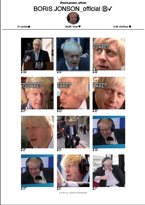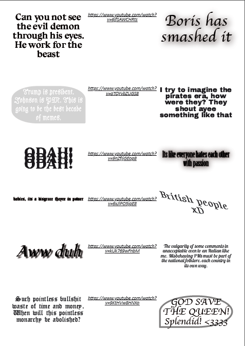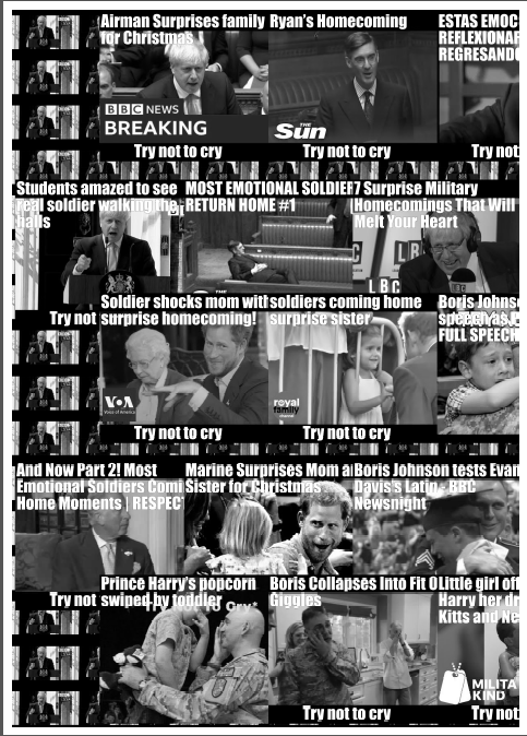 Lors de ma recherche, je suis passée de vidéos de politique anglaise (surtout sur Boris Johnson), à des vidéos du Prince Harry puis à des vidéos de homecomings de militaires américains. Pour mon poster, j’ai voulu mettre en avant le côté assez absurde des liens faits par YouTube entre les vidéos, et l’écart existant entre les premières vidéos regardées et les dernières proposées par YouTube. Pour cela, je suis me suis inspirée de l’esthétique des memes présentes sur certaines de mes vidéos et j’en ai créés des nouveaux. J’ai décontextualisé les éléments en inversant les titres et les images (j’ai mis le titre d’une vidéo de militaires avec une image de Boris Johnson par exemple), et en ajoutant l’expression “Try not to cry”, ce qui crée une nouvelle narration et qui souligne l’écart entre les vidéos proposées.