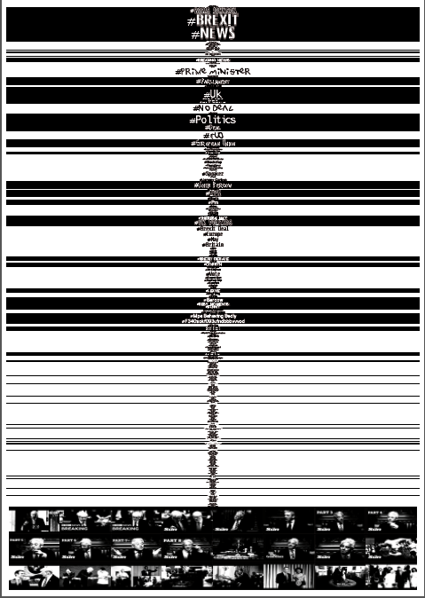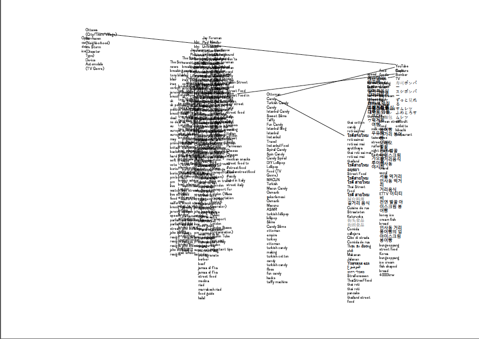 Sur toutes les informations issues des 30 vidéos chargées par l'algorithme de YouTube, j'ai décidé de ne garder que les tags et les miniatures qui y étaient liés. Par conséquent, dans ma démarche graphique, les tags sont reliés par leur taille et leur typo, en fonction de leur récurrence à travers les 30 vidéos "aléatoires". En-dessous, j'ai souhaité regrouper toutes les miniatures pour ainsi pouvoir se faire une idée de quoi dépendent ces tags et ainsi pouvoir créer des liens. À travers l'expérimentation, je suis arrivé à une version finale trouvant davantage de sens pour moi dans sa forme globale. En effet, la forme générale observée à l'horizontale ressemble à un code-barre, rappelant à quel point l’algorithme nous mercantilise et fait de nous, spectateurs, la marchandise. Comme le dit le dicton, «Quand c’est gratuit, c’est toi le produit.». Qui plus est, encore une fois lorsque l'on regarde à l'horizontal, on peut également distinguer plus subtilement une sorte de fréquence cardiaque formée par les différences de longueur du texte, pouvant de ce fait donner vie à la machine qu’est l’algorithme.