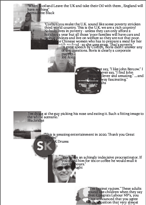 À travers le html généré à la suite des vidéos youtube, j’ai remarqué qu’il y avait de nombreux commentaires divergents. J’ai donc décidé de les mettre en lien, car sans le savoir, les internautes se répondaient entre eux et généraient un «clash . En les plaçant face à face, et en uElisant un système simple de mise en page, avec l’url dans la colonne centrale, j’ai placé de chaque coté, un commentaire afin de les mettre en réponse, en opposition.