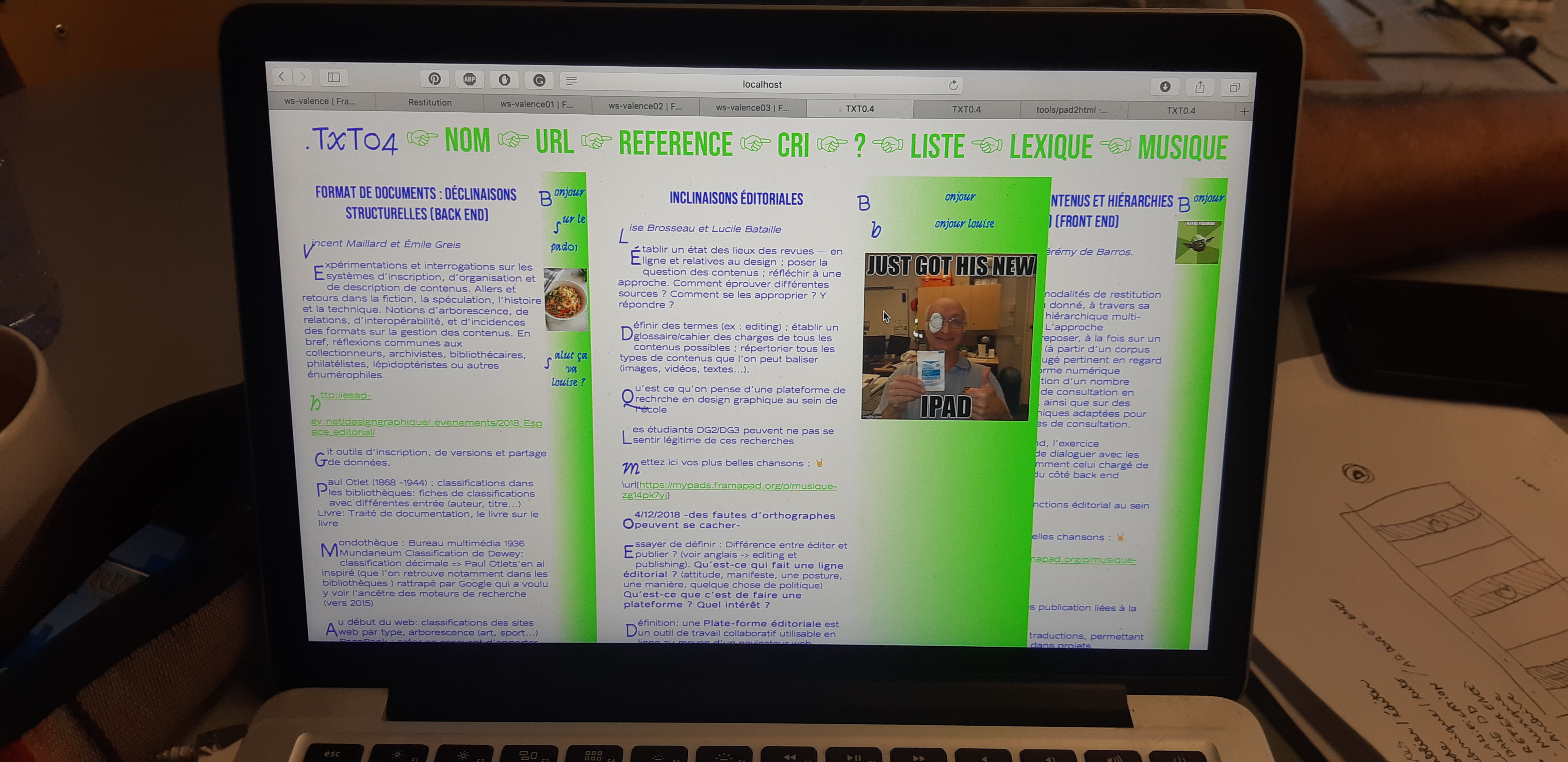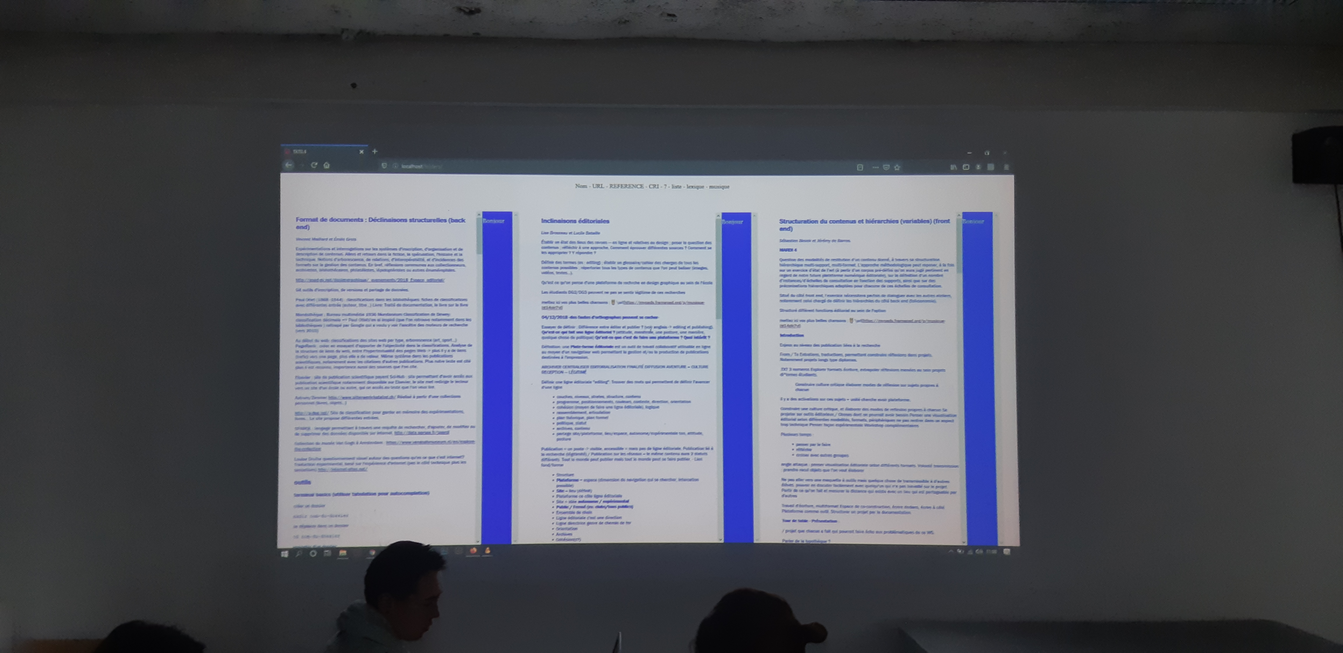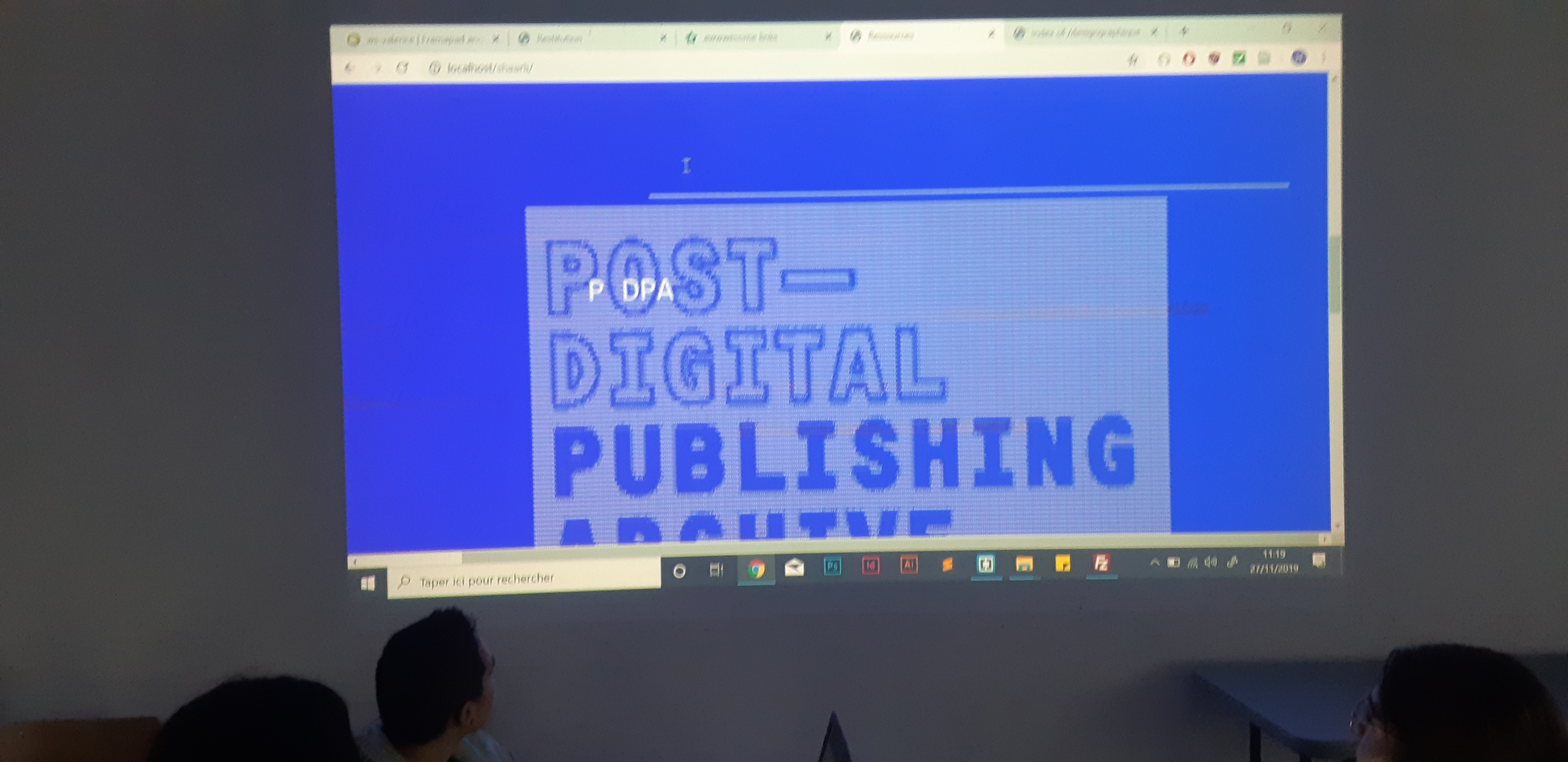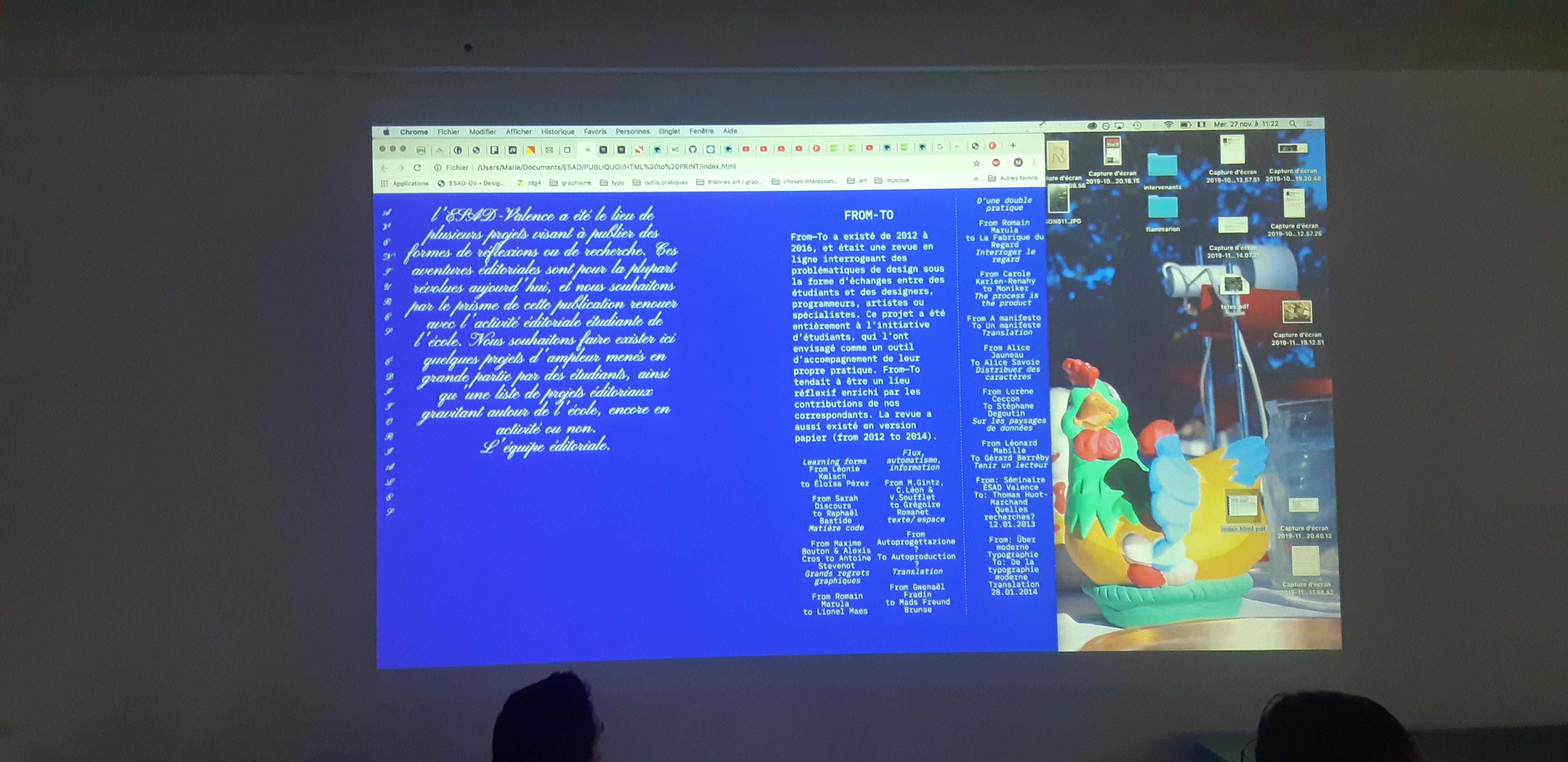 Durant trois jours, du 25 au 27 novembre 2019, nous avons exploré avec les 4e années design Graphique de l'ESAD Valence différentes méthodes, outils et formes de publication en ligne exotiques dans le but de restituer l'évenement qui se déroula en décembre 2018, et qui proposa une série de workshop, une journée d’étude et une table ronde autour de la publication en ligne.