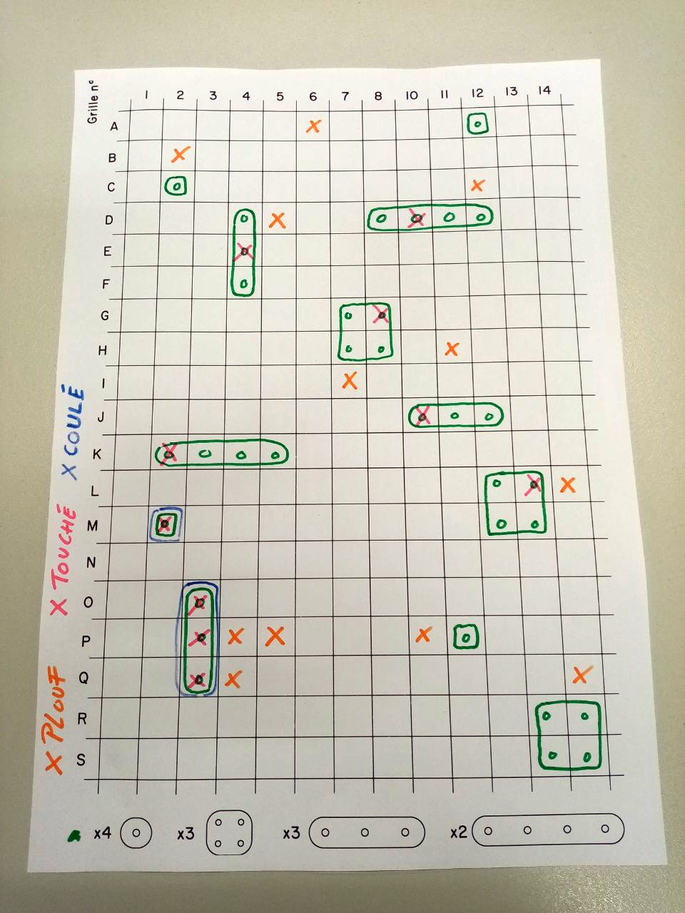 - On commence à jouer (pour rappel les règles du jeu) en prenant soin de noter sur sa grille de manière distincte quand un coupe tombe à côté, un coup touche, plusieurs coups coulent (comme l'image ci dessous)
