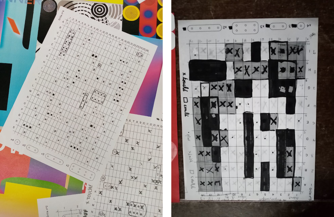 Dans un premier temps on joue par équipe à la bataille navale sur divers grilles distribuées. Chaque élément (touché, coulé, à côté) est soigneusement anoté et servira à attribuer des classes sur des éléments positionnés sur une grille CSS. ↷
